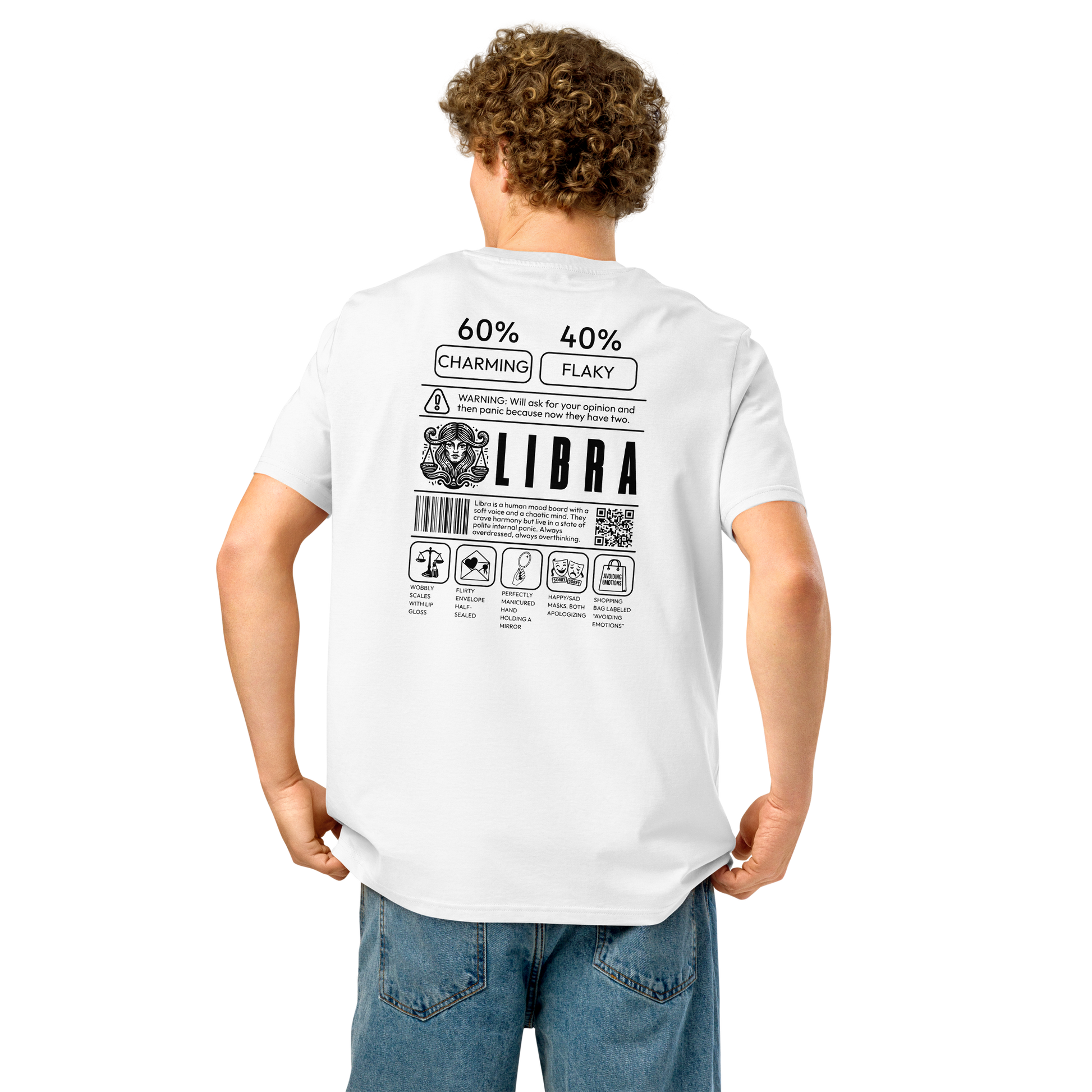 Charm and chaos in equal measure. A wobbly scale? Lip gloss, obviously. This Libra shirt flirts, apologizes, and accessorizes. Designed with a barcode and balance in mind.