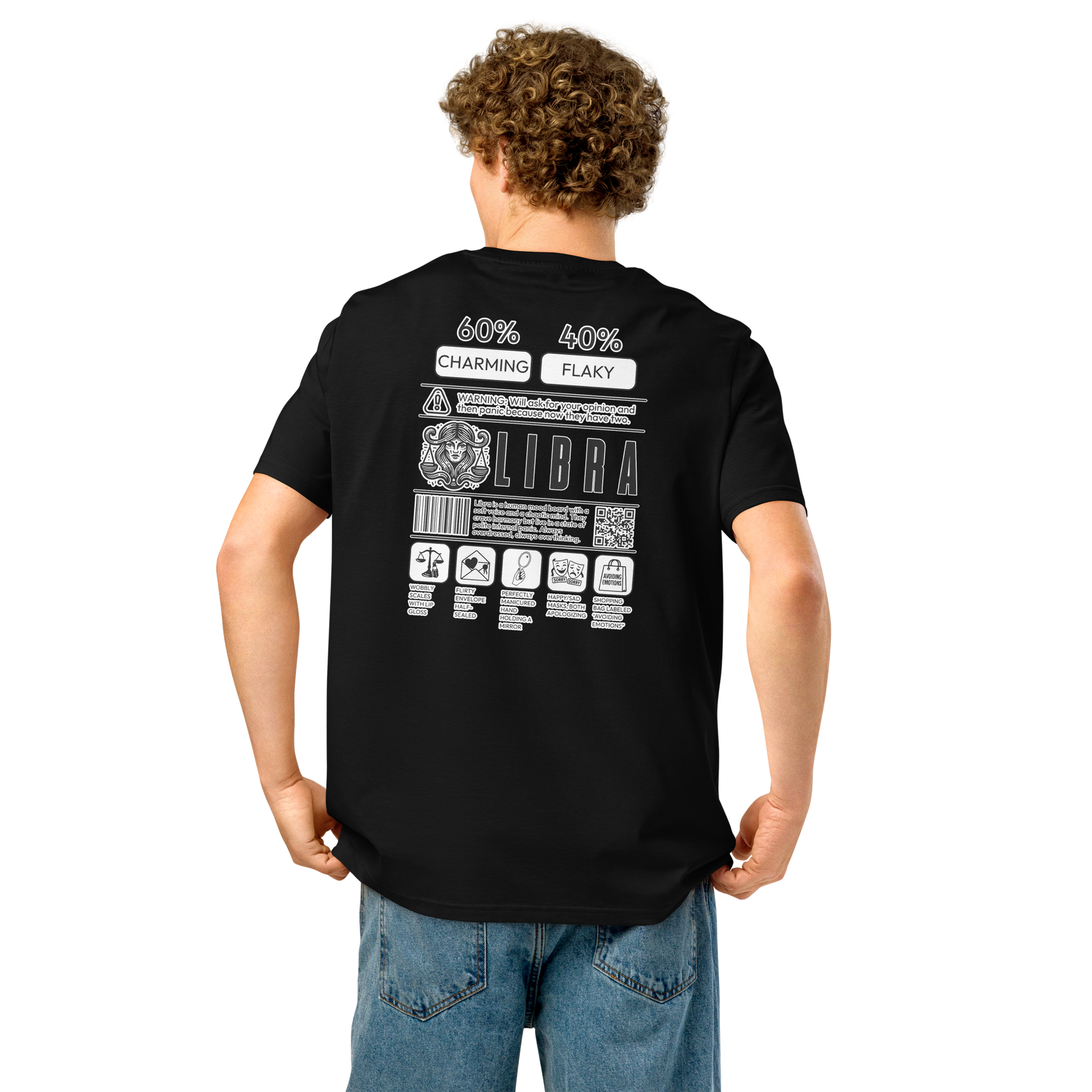 Charm and chaos in equal measure. A wobbly scale? Lip gloss, obviously. This Libra shirt flirts, apologizes, and accessorizes. Designed with a barcode and balance in mind.